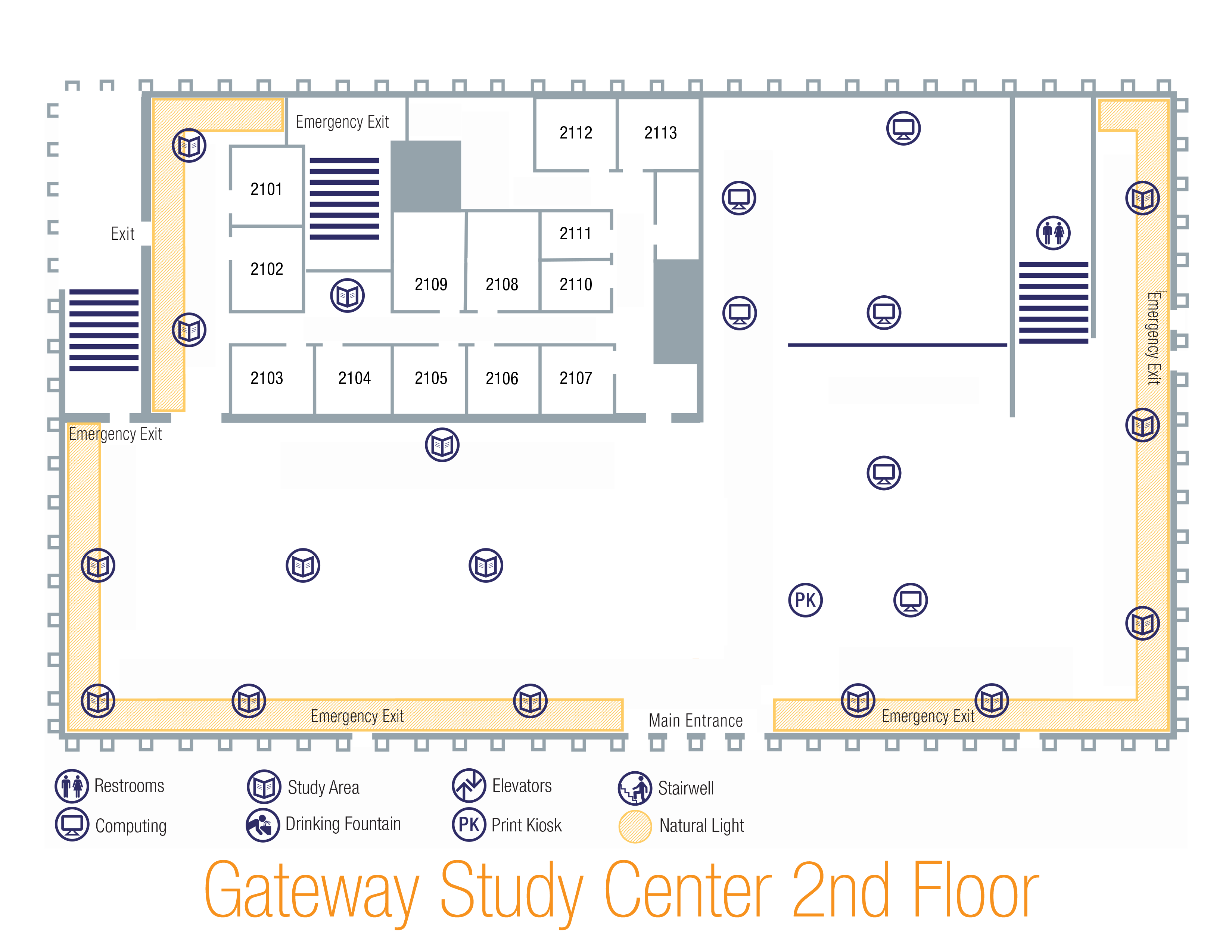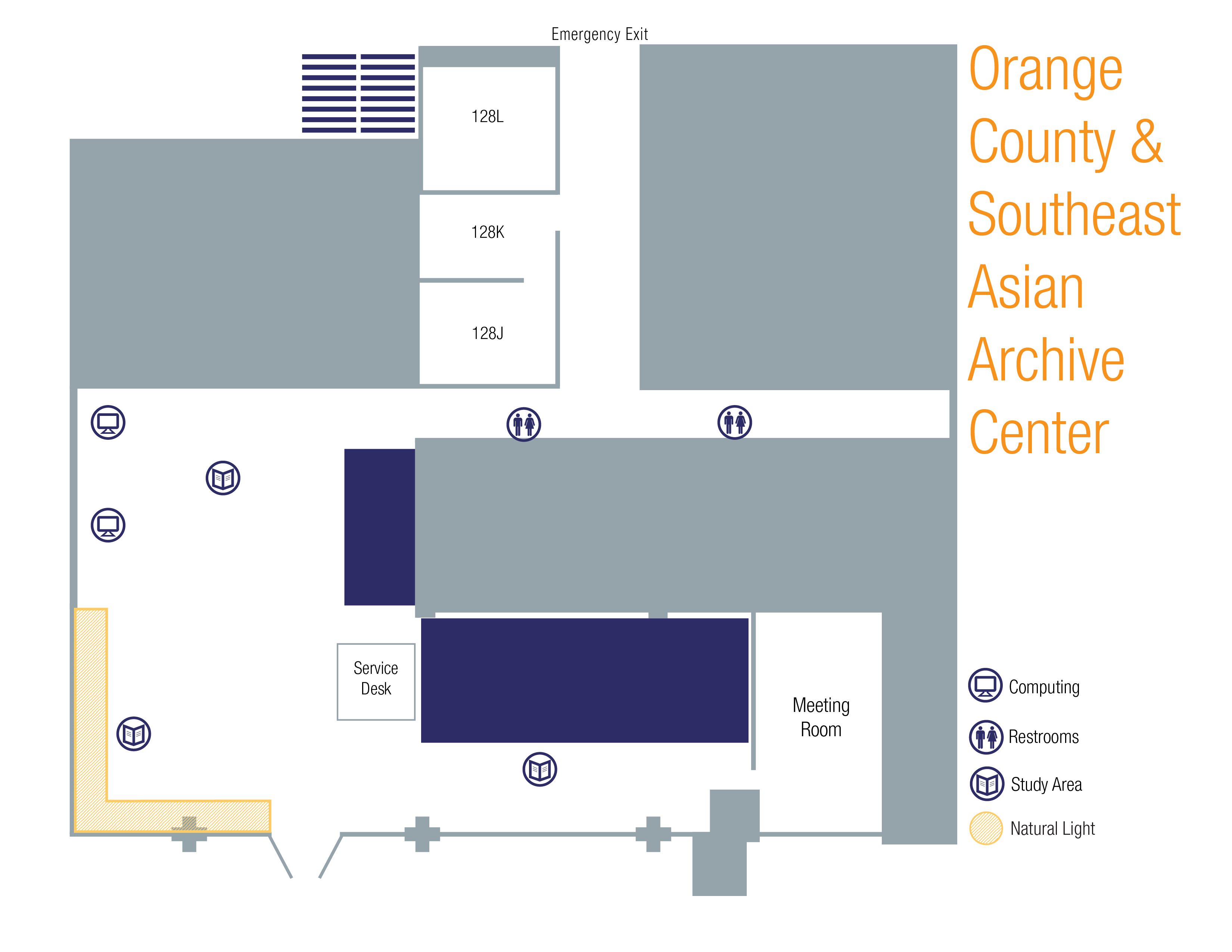 The second floor of the Libraries Gateway Study Center houses a computer lab, study rooms, and collaborative workspaces. The Orange County & Southeast Asian Archive (OC&SEAA) Center can be found on the first floor.