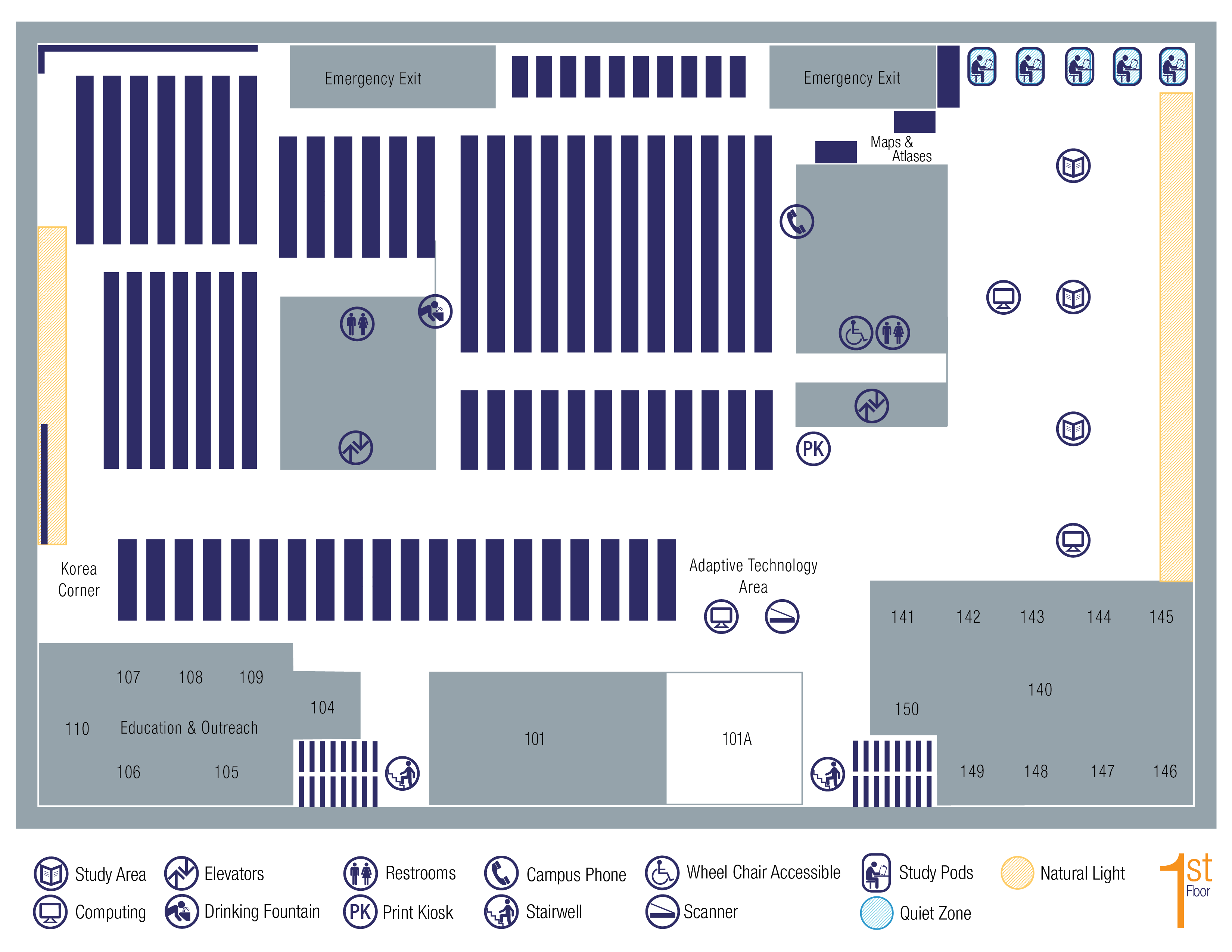 The Korea Corner, provides Korean literature, history, and cultural resources for students, faculty, and the community. It is furnished with comfortable seating and provides convenient access to a multiregion media player to view Korea related videos.